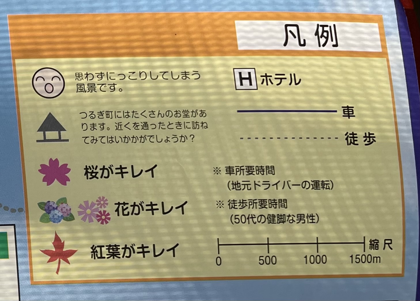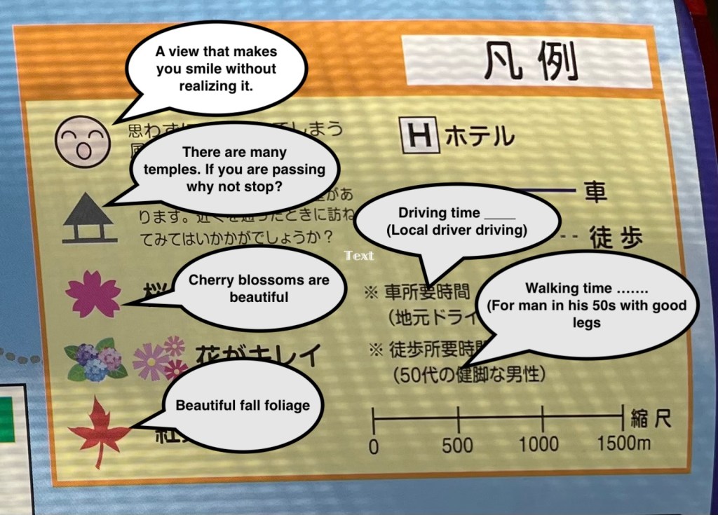 The Oh Wow face indicates a view that will leave you smiling no matter what. The little house represents one of the many temples that deserve a minute of your time. The flowers and leaf indicate seasonal views. Mileage distances are given for people who were smart enough to hire local drivers. If you weren’t – sorry but I guess it will take you longer especially if you stop at all the temples along the way. If you decide to walk to a point of interest, you’d better be a man under 50 with good legs otherwise all bets are off. It could take you a loooooong time.