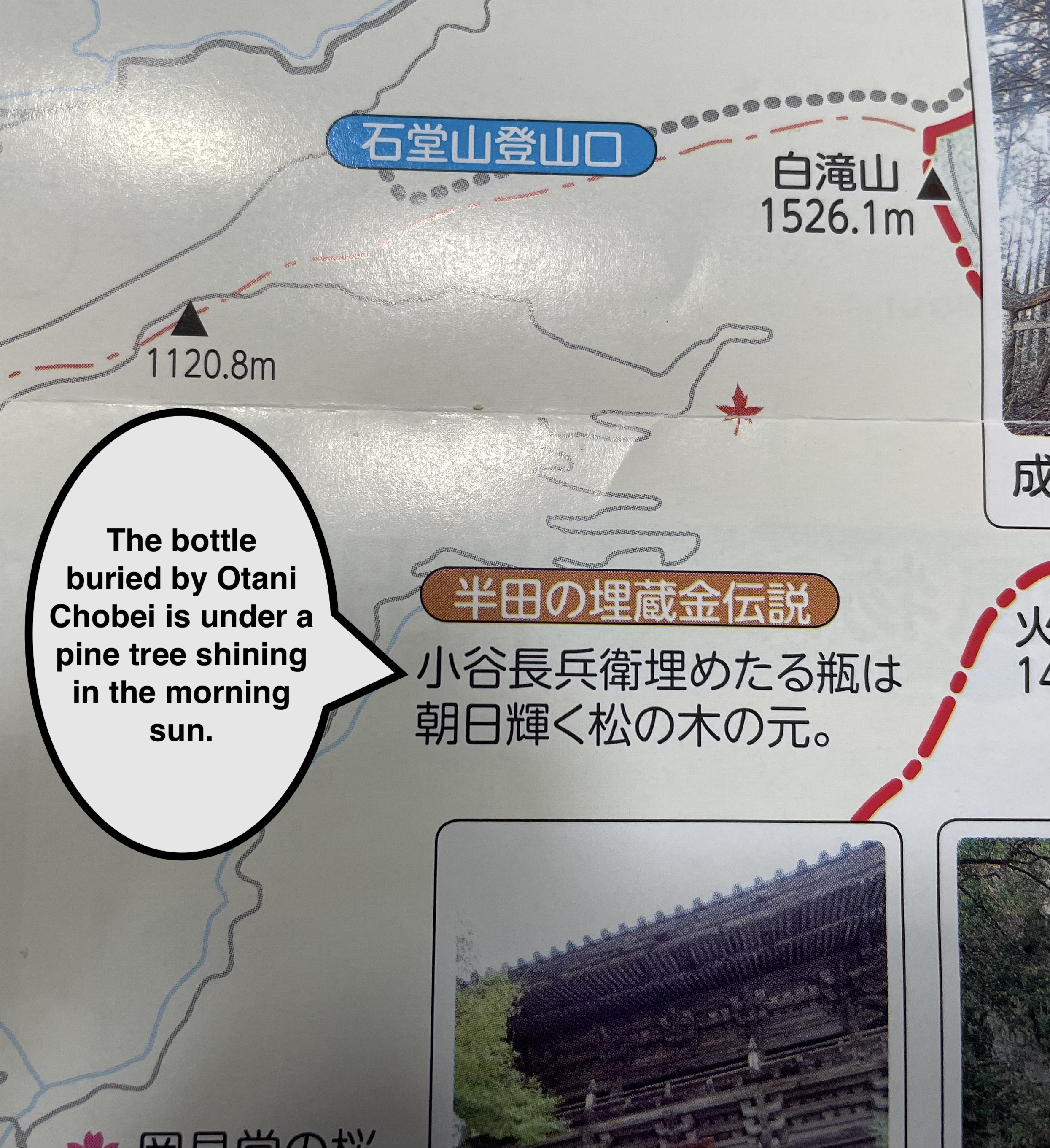 In case anyone wants to know where Otani Chobei buried the bottle, it’s apparently under a pine tree overlooking a twisty mountain road along which there’s beautiful foliage in the fall. At first I thought Otani Chobei was a famous Japanese politician who had a drinking problem but “buried the bottle.” Or a Samurai warrior who made a secret pact with an unpopular Emperor. He’d had to bury the agreement in a bottle under a pine tree lest his treachery be revealed should the Emperor be dethroned. Or beheaded or whatever happened to unpopular Emperors.