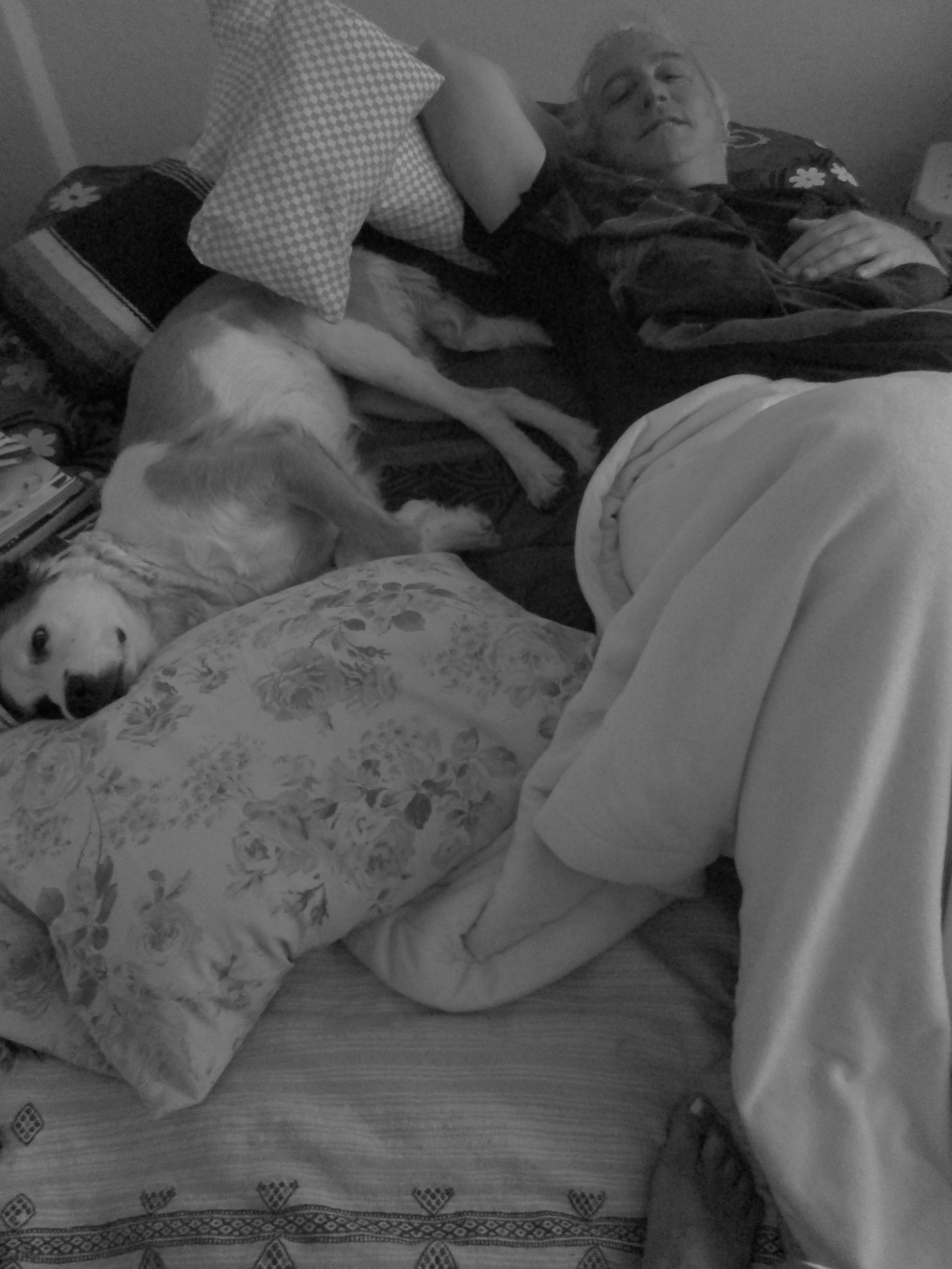 Now readers, I did not sneak into his boudoir to get this shot.  This is honest-to-God the picture Duke Miller sent me for this post which, since the title of his book includes “dog,”  is supposed to prove that he actually does live with dogs – or at least sleep with them.