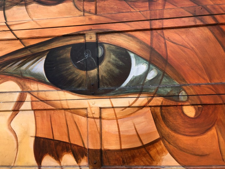 The murals in the Mission are an example of a community working together with artists to transform alleys into places where you want to hang out and not simply get through as fast as possible. They reflect the histories and passions of the residents and also provide an escape pod for the imagination. For example, if you look closely in the mural below (painted on a garage door and thus eligible for entry in Norm Frampton’s #ThursdayDoors event) you can see a  figure in the pupil of the eye.  If I had to guess I’d say it’s a soldier in a helmet.