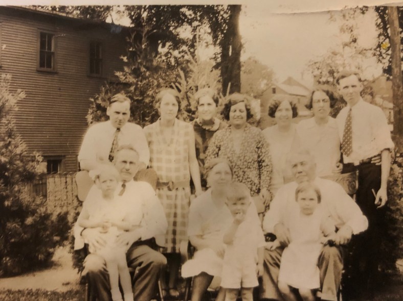 Unlike his daughter, my great grandfather seemed only too happy to have his picture taken.  In this gathering he’s the fella sitting on the right with a little girl on his lap.  The couple behind him are my grandparents and thus the little girl must be my mother. So who is the elderly lady sitting next to great gramps?  She can’t be his wife because we’ve already established that she died before my mother was born.  She must be that friendly neighbor lady, Mrs. Pease.