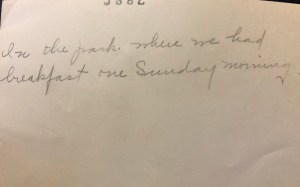 On the back of this picture is written: In the park where we had breakfast one Sunday morning.
