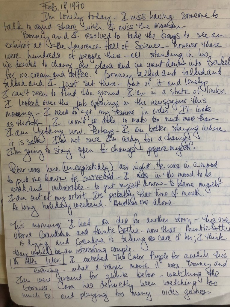 For the most part, the journals are filled with the frustrations of an artsy-fartsy, hippie-dippie woman raising children in a status-hungry suburb. It’s sort of a Stranger in a Strange Land scenario. Eventually she starts to drink during the day, gets addicted to soap operas, takes up macrame and bitches and whines a lot. On top of all that, the journals are filled with the names of neighbors who came and went. If I don’t remember those people, my kids certainly aren’t going to.