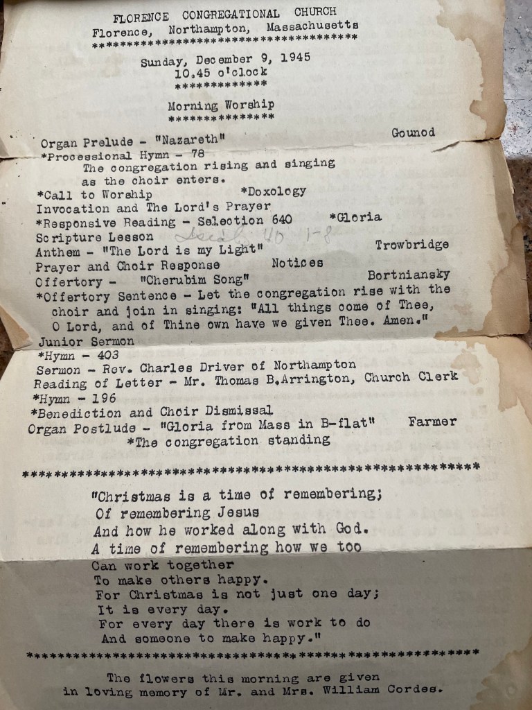 My first thought was “What was Cousin Gloria doing in Florence Mass?” Not that it was any of my business but let’s be honest. Writers are busybodies who are constantly sticking their noses in where they don’t belong and following clues to mysteries that are probably only mysteries in our overripe imaginations. It’s a writer’s curse. Anyway, my mother and her cousin were polar opposites. The only thing they had in common was they both attended UMass in Amherst and guess what? Amherst and Florence are sister cities. So I had unearthed a fascinating fact: In December of 1945, a young woman named Gloria attended services at a church near her college. Big deal. However, when I found out what the village was famous for, well, I was intrigued.