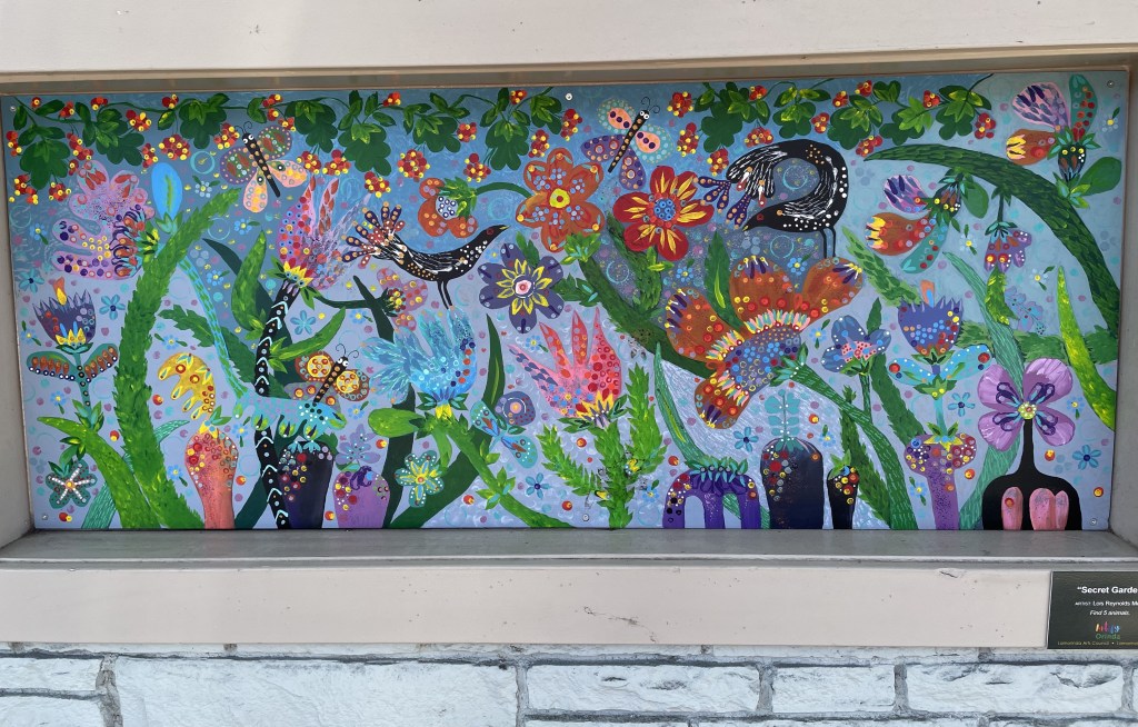 As you see, these murals have been set in recessed frames in a brick wall. This one invites the viewer to find five animals. I can only see butterflies and birds.