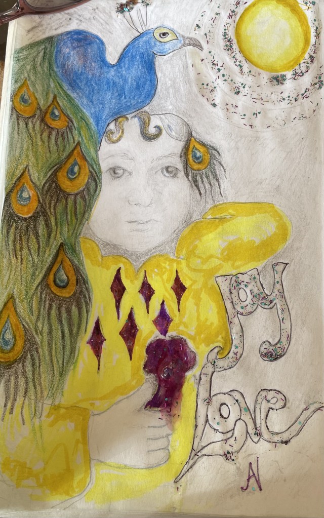 That picture is amazing. I cannot draw for the life of me, but I like how it took on a new spirit, with the peacock and the ice cream and all. And I just finished reading another blog post about someone trying to get home from San Diego on Southwest. I’ll bet that’s happening to lots of people right now, yeah? Glad you’re getting some down time.