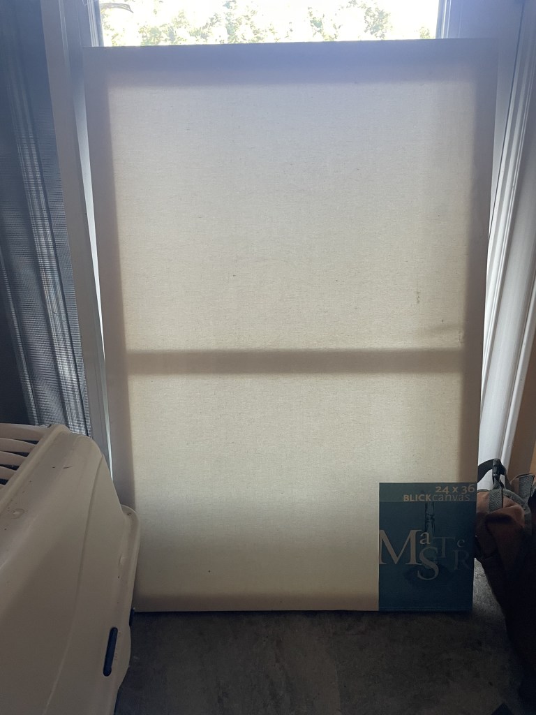 There is no truer truth than “growing old is not for sissies” and I am a sissy. However I have not been given the sissy’s way out which I guess is either death or complete dementia and so, with a solid “ugh,” over the weekend I accepted a new set of numbers. This set of numbers, my friend tells me, when added together is 10 or 1 which in numerology means a new beginning. Double ugh. I’m too old for new beginnings. Can’t all my old beginnings join together for a beautiful ending? However, over the long weekend I found myself drawn to a blank canvas sitting in the hall.