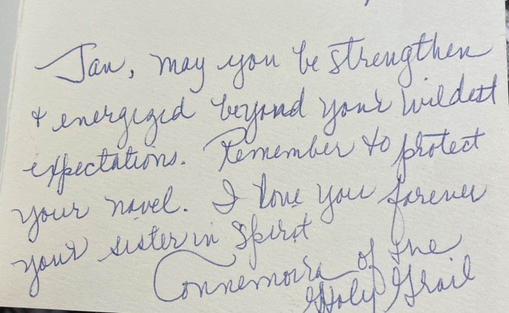 The “novel” she was talking about was just a rough draft back then. I did finally finish and publish the darned thing (unfortunately just after her passing) but was never happy with it. But now I think I know why. So I guess you could say, her note was my door for the week.