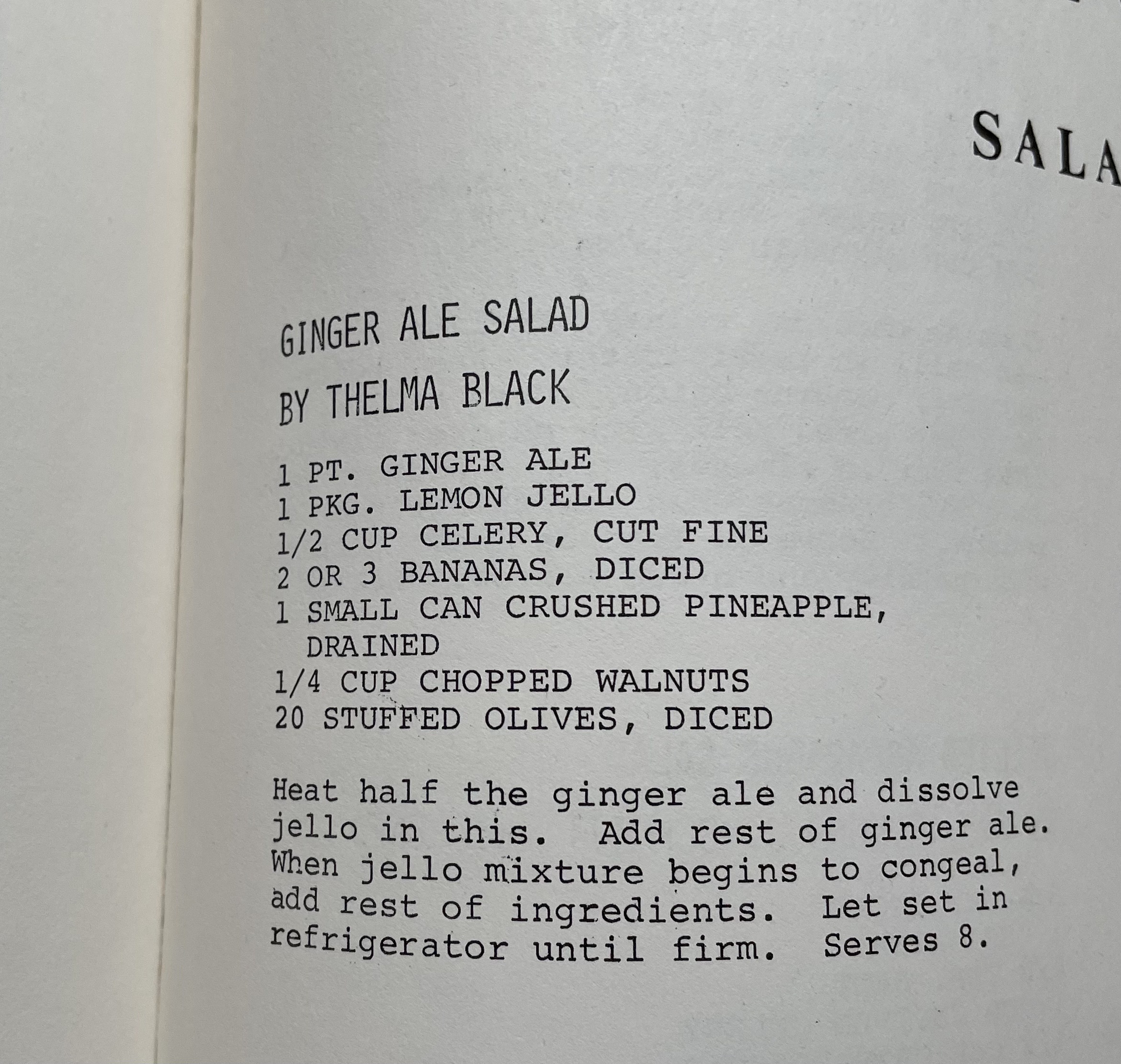 Have any of you ever tasted Ginger Ale Salad? It sounded okay until the stuffed olives. Well, I don’t know about the celery and banana combo but then I’m a notoriously picky eater.