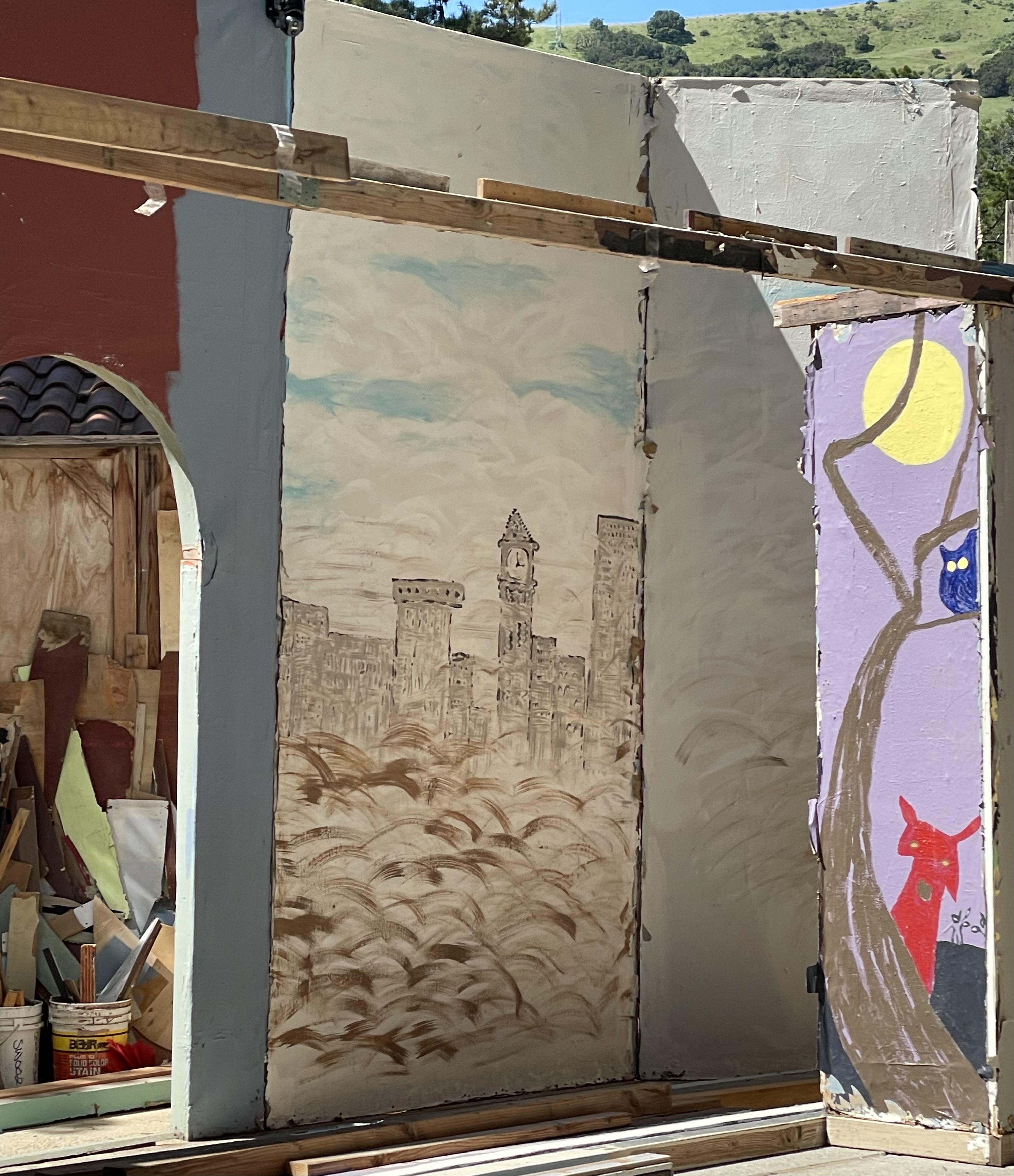 There are two panels in front of the skyline also in process. Red foxes, blue owls, a full moon – and is that a bear approaching? We’ll have to wait and see.