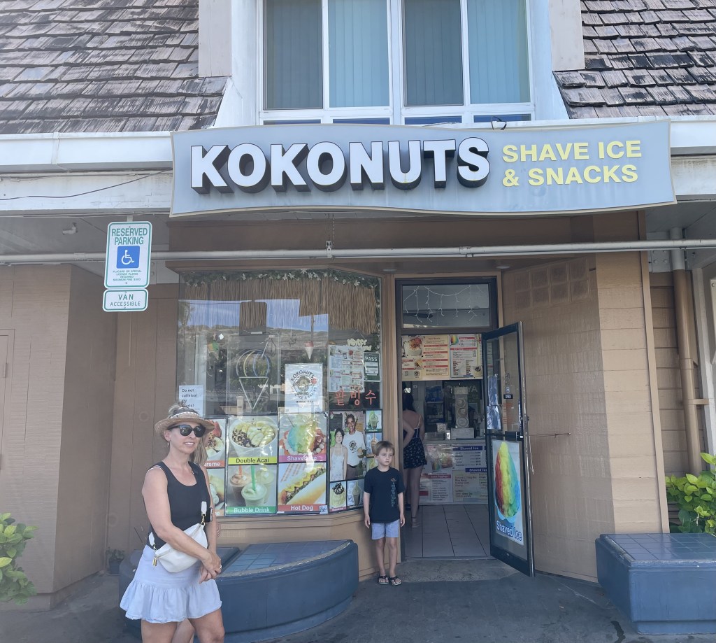 This cutie pie (growing up way too fast) is standing next to a picture of the very famous man who frequents Kokonuts every time he’s on Oahu. His initials are BO. Don’t ask me how these shaved ice thingies taste. I’d had a knockoff at Sea Life the day before and was not impressed.