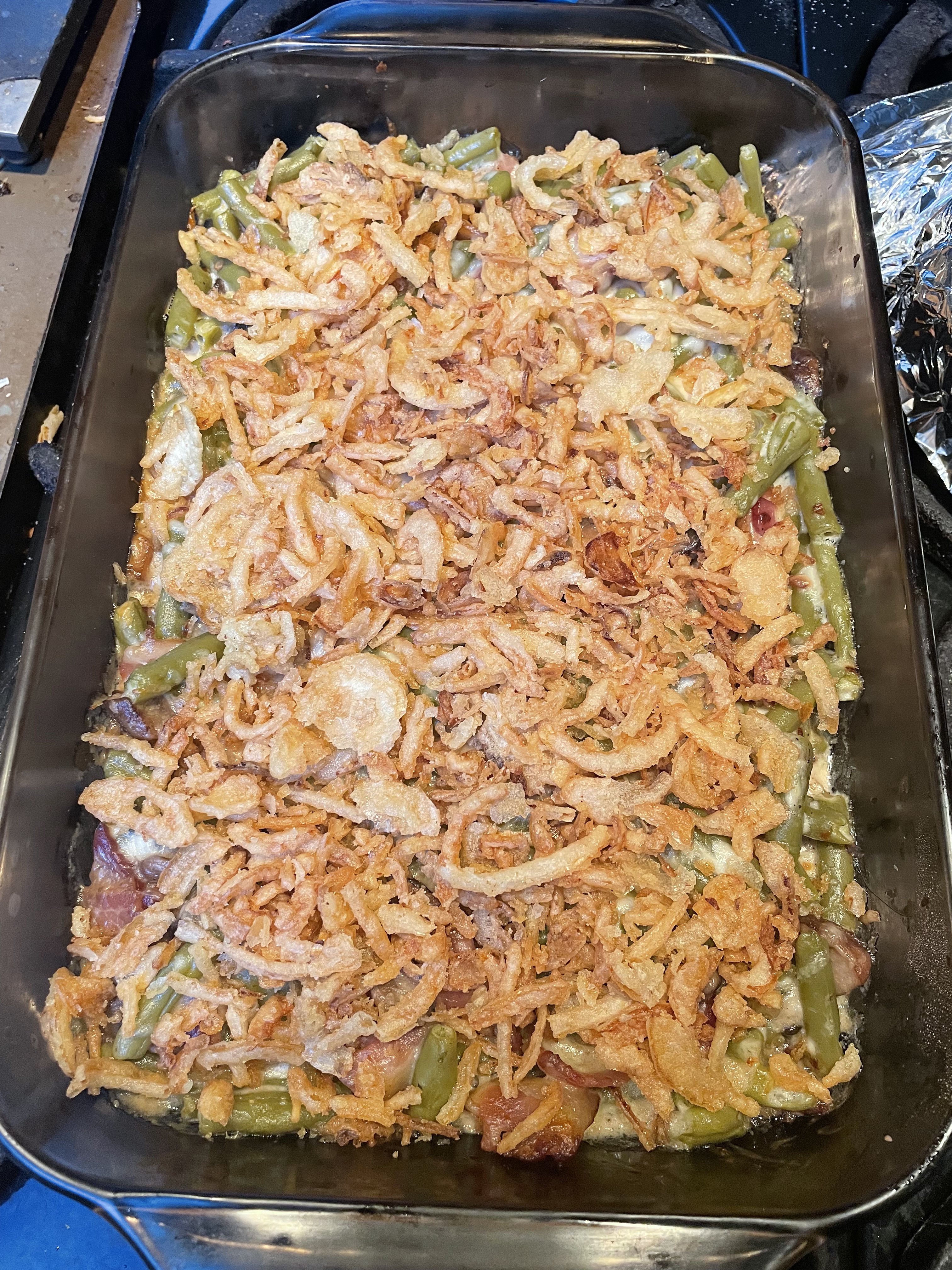 Growing up I used to hate the above dish (Campbell’s green bean casserole). Don’t tell Campbell’s but in my rendition of this traditional dish, I did not use their canned mushroom soup! I made my own creamy, cheesey white sauce with fresh sauteed mushrooms and garlic. I also omitted the generous dose of soy sauce my mother always added. It was way too salty! I don’t really know why I decided to give it a try after all these years … my way, of course. Nostalgia I suppose.
