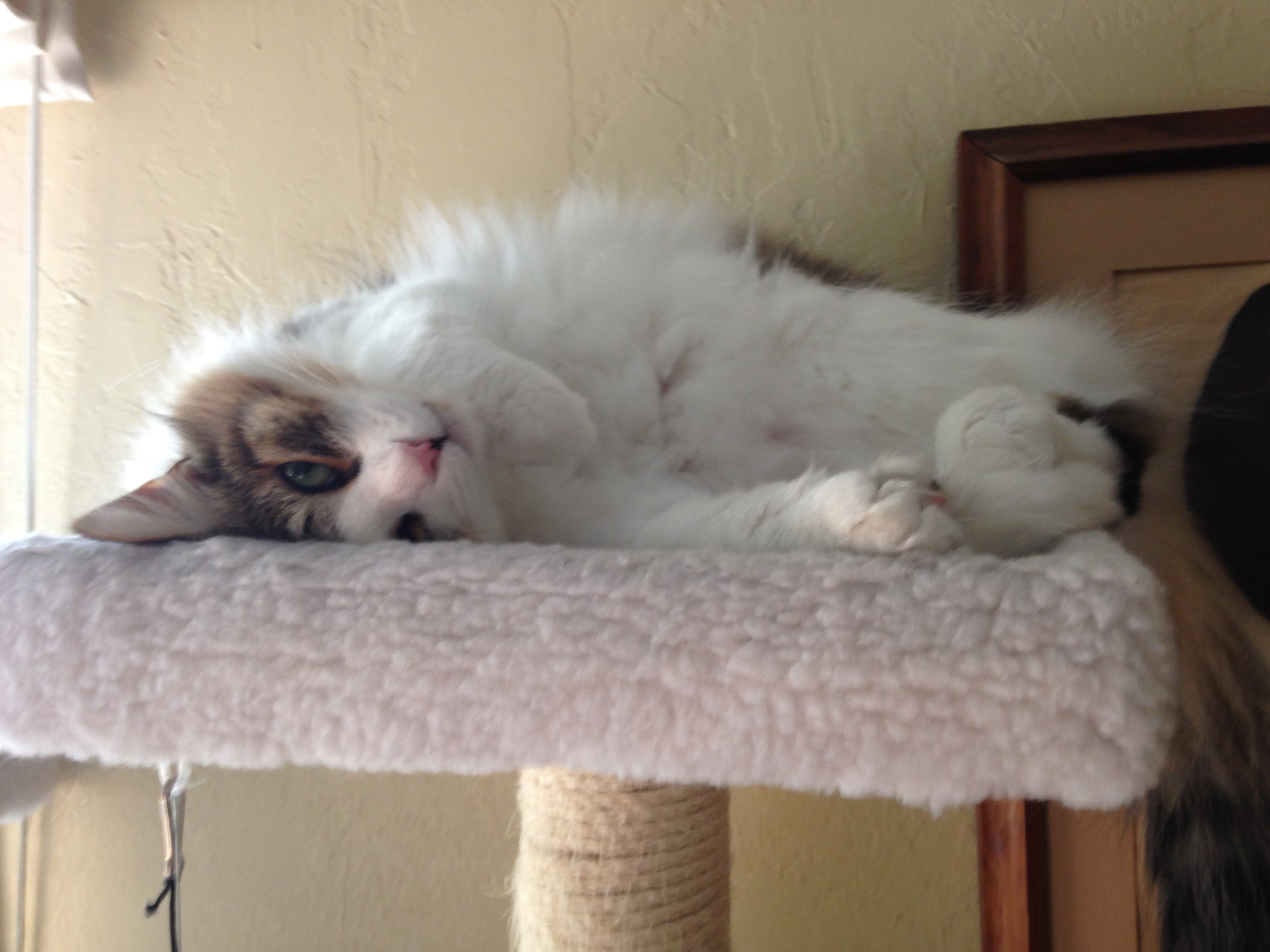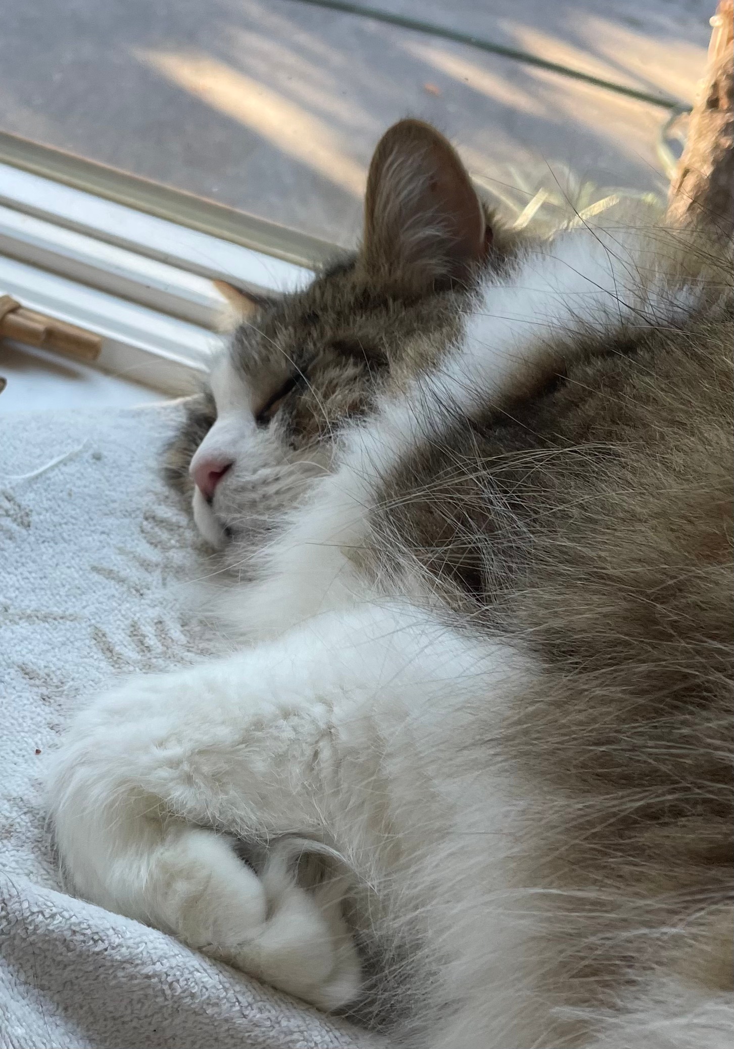 Way back in 2013 this cat started showing up on our deck. I guess he/she figured my husband fed the birds and squirrels and so why not feed him/her as well? But … cats and birds generally don’t get along and so hubby shooed him/her off the deck and out of our yard. We couldn’t imagine such a beautiful cat was homeless. And then the weather turned cold and we discovered the cat had been taking refuge under a pile of plant covers left on the bottom deck. Long story short, we ended up dragging the beast, by this time, its long fur matted in filthy dreadlocks, off the deck. For two weeks the cat hid out downstairs but thankfully knew how to use a litter box! Another long story short, the cat turned out to be a neutered male and unable to find his owners, we more or less adopted him.