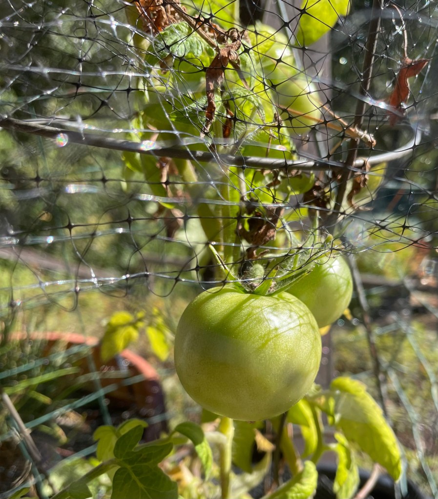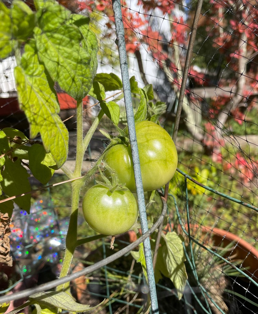 I’m hoping the cold weather will hold off long enough for these, my only tomatoes after months and months, to finally ripen.