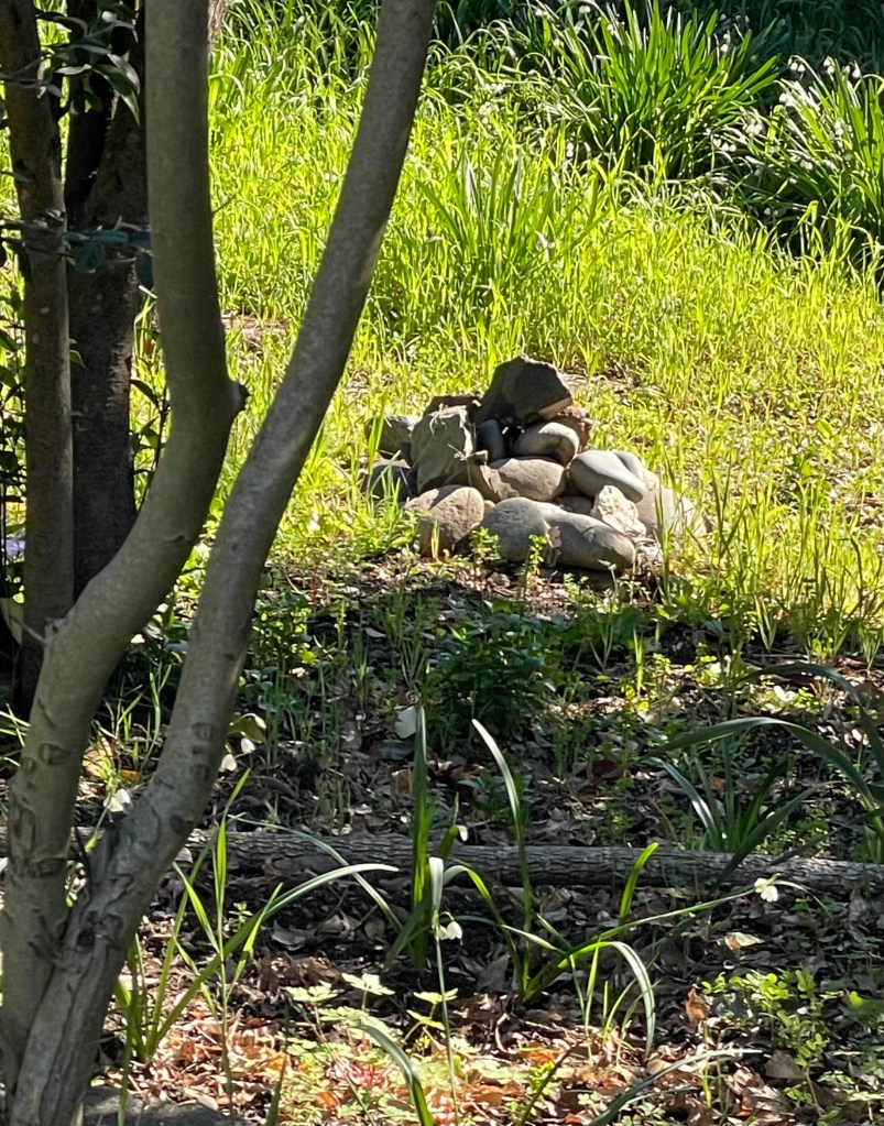 One of my neighbors had a curious pile of stones sitting in his delightfully overgrown garden. Perhaps the resting place of a favorite fur baby? Who knows. Otherwise the neighborhood is typically suburban. I can’t prove that to you because, as I’ve complained about before, most of my neighbors have cameras mounted on their garages or over their front doors taking nonstop of pictures of anything that moves. I’m just paranoid enough to imagine seeing my face flashed all over social media with the caption “Do you know this sick pervert taking pictures of my front yard?”
