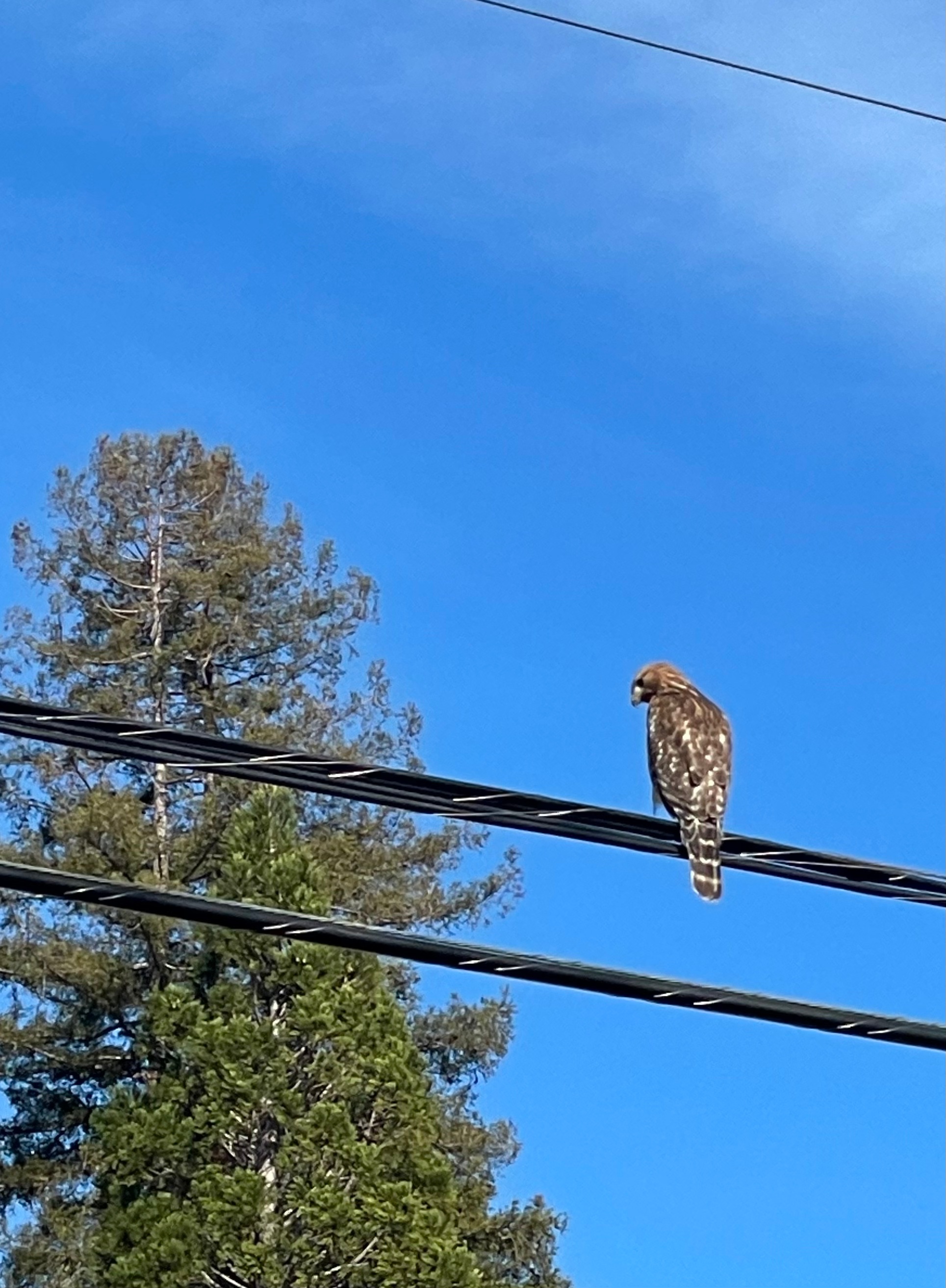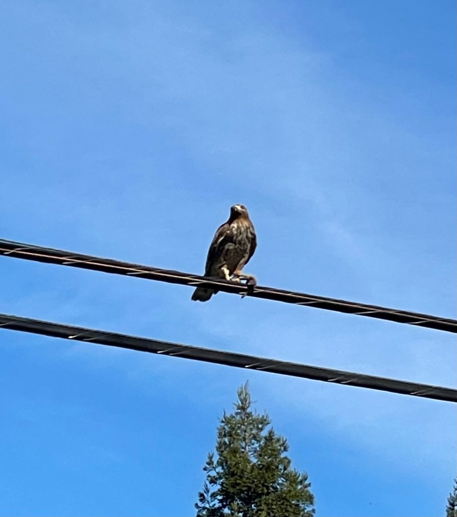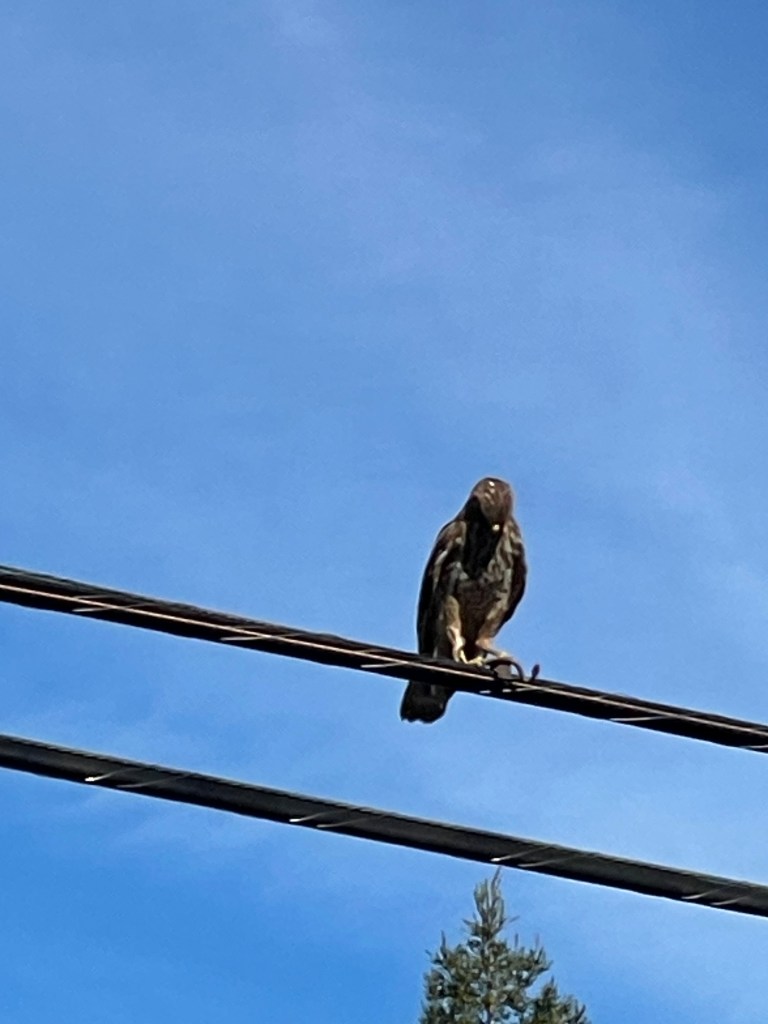 On my way back home I noticed the hawk was still perched on the wire but not for long. Before I could adjust my camera (iPhone) on him, he’d swooped down into a garden, thrashed about a few minutes and then returned triumphant. This time facing me proudly clutching his prey.