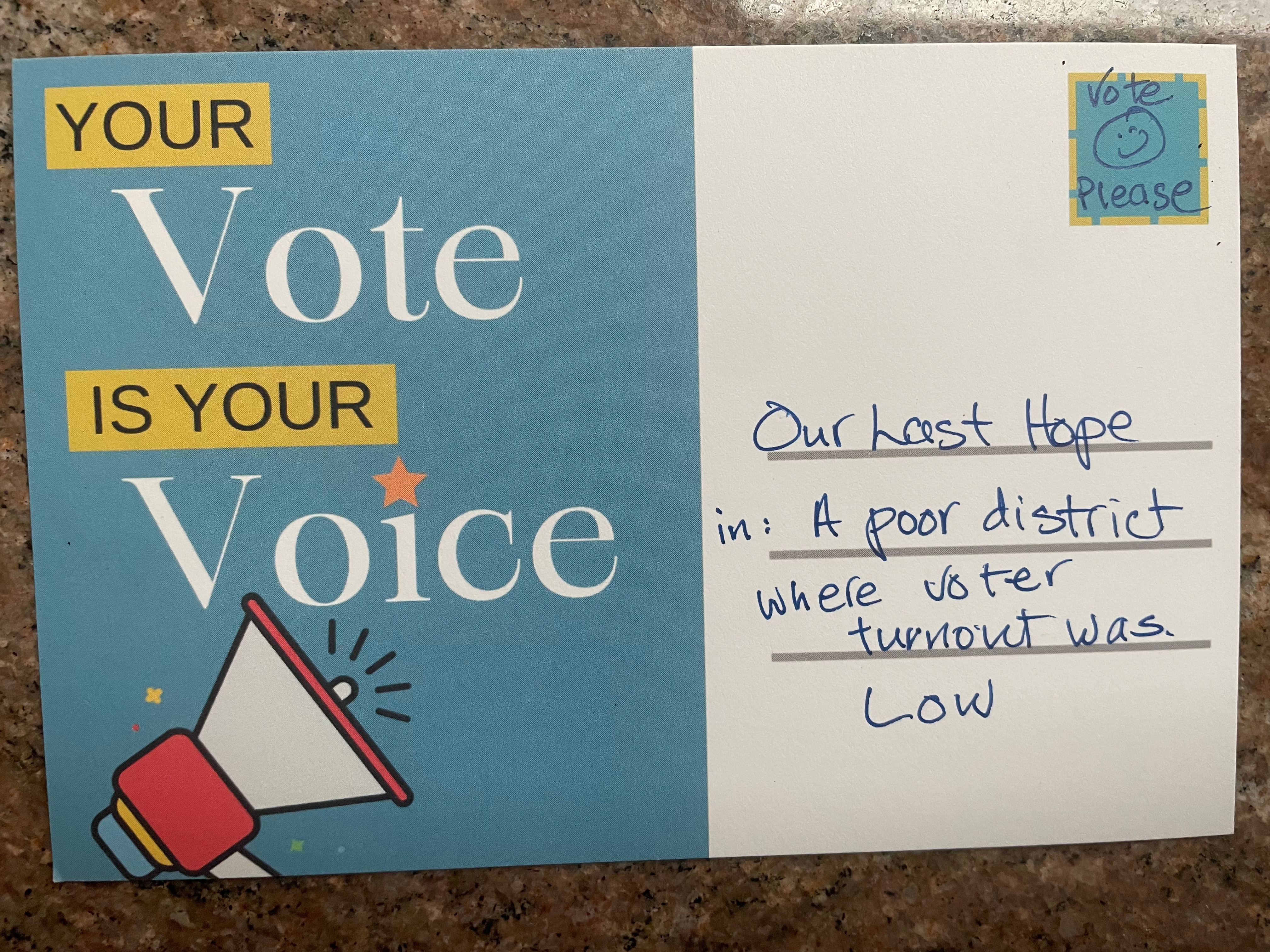 Whelp, I did it again. Went to another postcard party along with approximately sixty of my fellow citizens, most of whom I’d never met before. This time the mood was different and the messages we sent were more desperate.