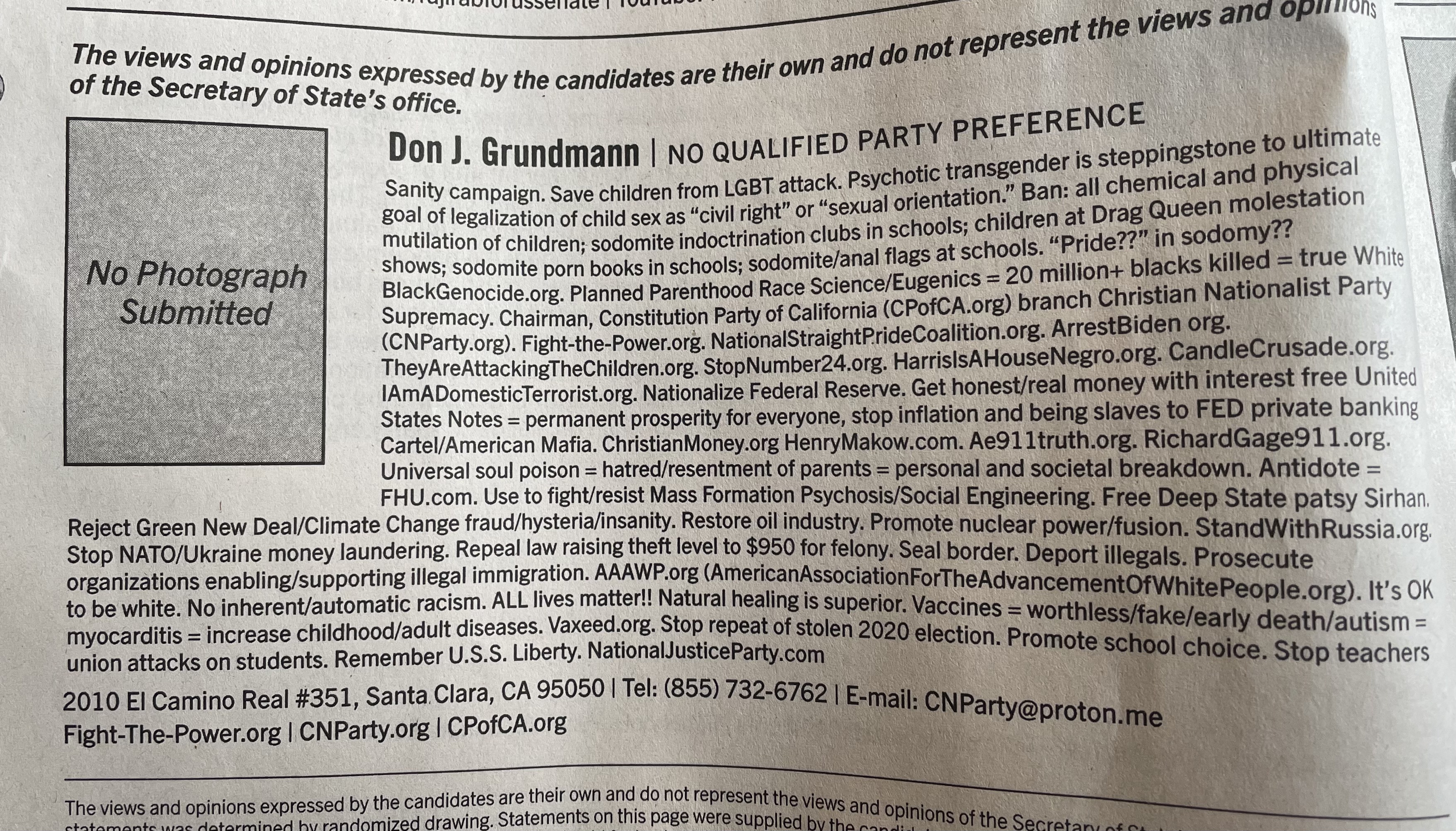 Some candidates submitted a statement but no photo. If you read through Mr. Grundmann’s diatribe you can figure out why. What do you suppose NO QUALIFIED PARTY means? Is the MAGA wing of the republican party changing it’s name?